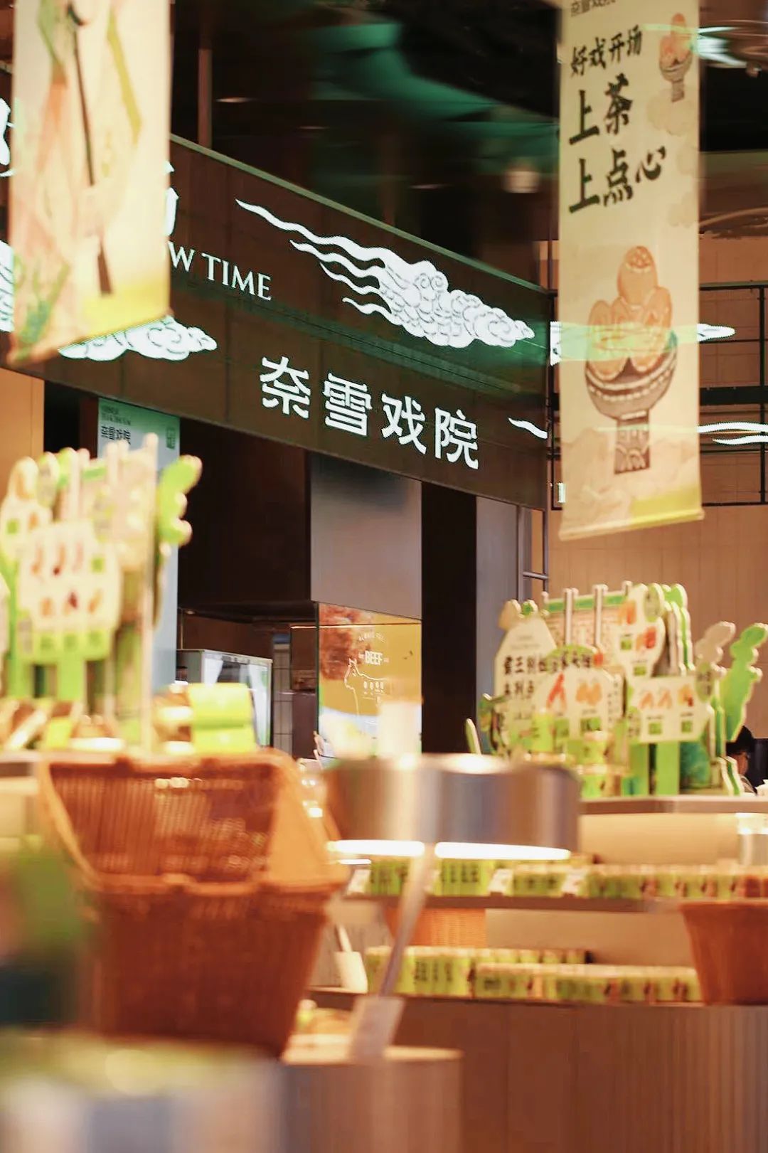 此外,奈雪戏院在设计上也注入了戏曲元素,整体视觉呈现为绿色主色调,立绘、包装、杯贴标签等美术方面,以皮影戏元素为主要设计,强调戏曲的形象。在门店场景上,通过中式吊幔、堆头、电子屏幕等营造出梨园的感觉。