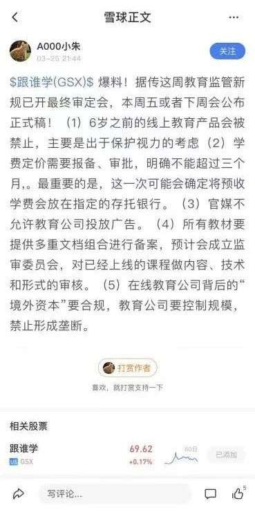 在线教育股价闪崩的背后,是一则未经官方确认的监管政策变化传闻。该贴在热传一段时间后,发帖人已将帖子删除。