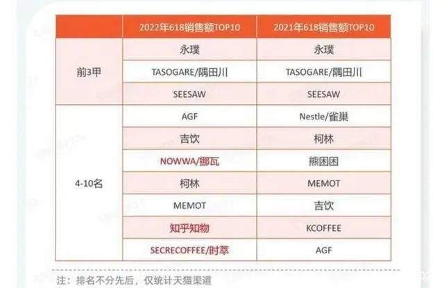 在2022年的618销量排行榜中,Seesaw作为实体咖啡馆开拓线上的新品牌,在618咖啡液品类中名列前3。平价咖啡品牌挪瓦,在这场零售咖啡“销量战”中也排到了第六名,超过了时萃。