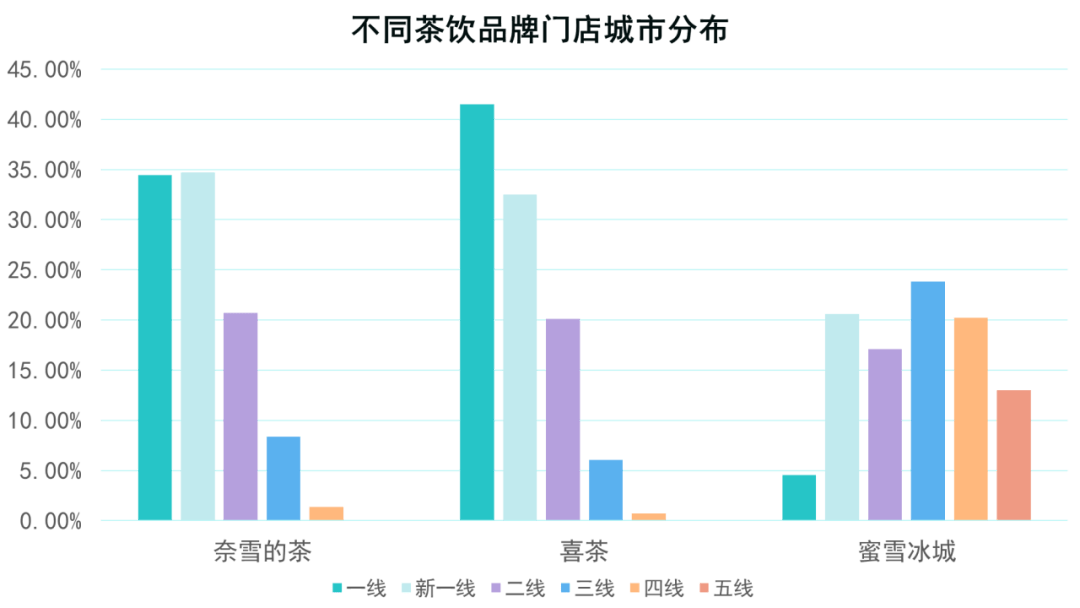 通过对比可以看出,喜茶和奈雪的茶经营重心是集聚在相对发达的一线和新一线城市,门店分布数量随着城市层级降低而减少;蜜雪冰城则反其道而行之,一线城市门店数量占比最少,其他城市分布相对均匀,二线和三线城市分布数量最多。
