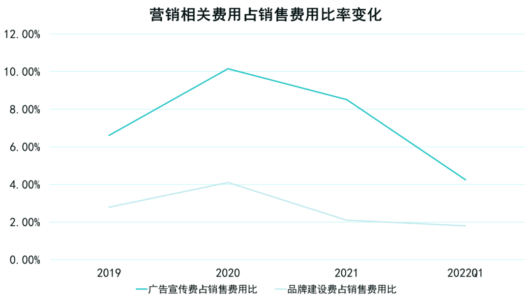 可以看到,蜜雪冰城营销相关的费用占总销售费用的比率逐年减少,这与销售网络构建起来后承担了部分营销效果及摊平了营销费用,有着高度相关性。