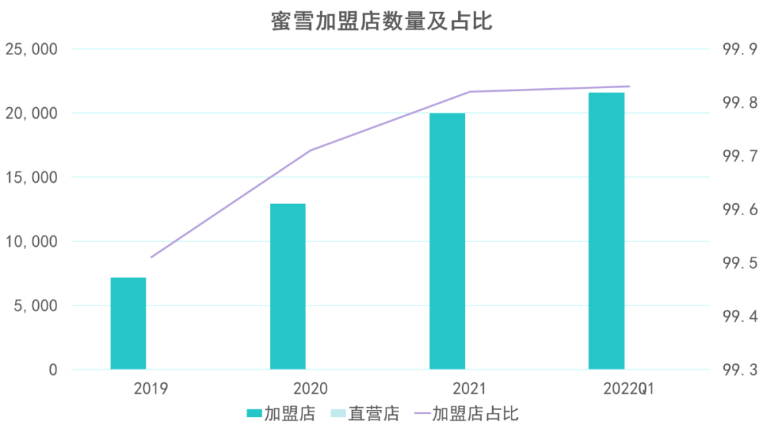 蜜雪冰城99%以上的门店是加盟店,并且这一占比还在逐渐上升。