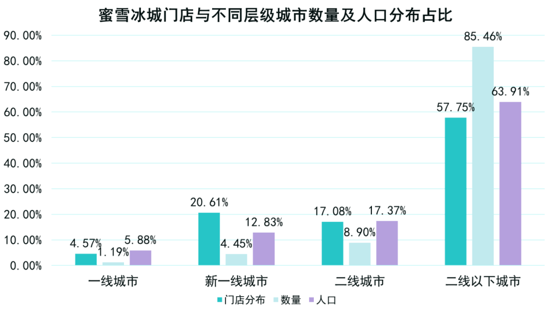 总体来看,蜜雪冰城在不同层级城市的门店分布,与这些城市的数量及对应人口相呼应。