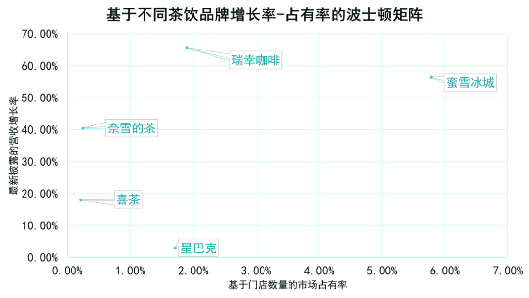 喜茶和奈雪的茶在茶饮品牌矩阵中未有明显优势,虽然保持着不低的营收增长率,但经营模式和相对较低的市场占有率难以支撑长期发展,面对经济周期波动时容易受到市场的考验。