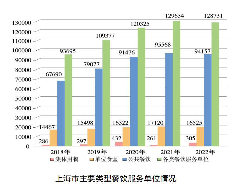 截至2022年底,上海共有持证餐饮服务单位128731家,虽然数量比2021年减少了0.7%,但仍比2019年增加了17.69%。