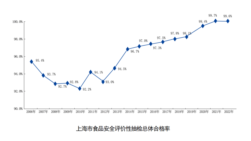 上海主要食品的食品安全总体监测合格率为99.6%,为近17年的第二高水平。上海的食品安全总体状况继续保持有序、可控、稳中向好的态势。