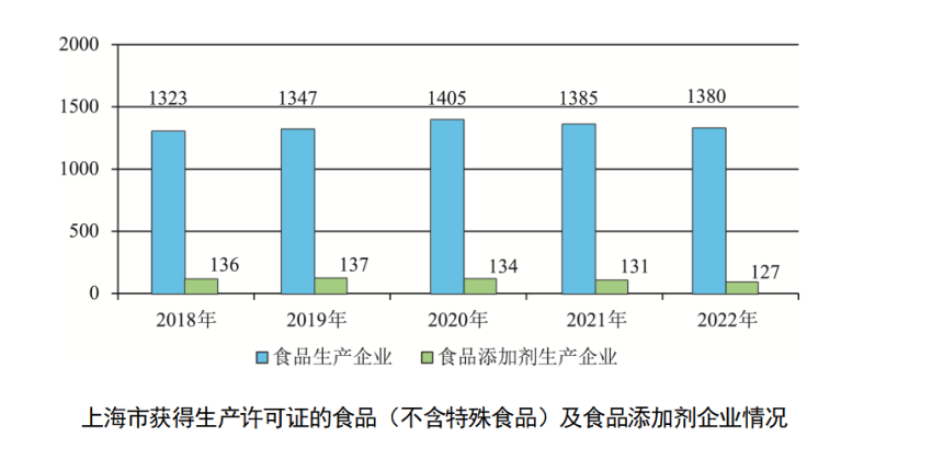 上海市场监管部门公布的数据显示,上海食品生产业近年进入了“减量期”——持证生产企业(不含特殊食品、食品添加剂生产企业)从2010年底的2210家减少到2018年底的1323家,2020年虽然数量有所反弹,但2021年再次回落,2022年减少至1380家。