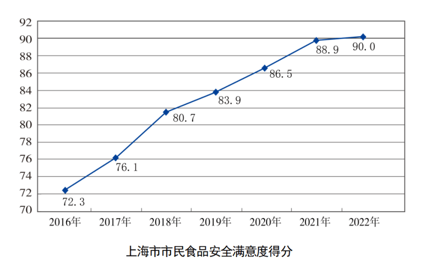 《上海市民食品安全满意度调查报告(2022年度)》显示,2022年上海市民对食品安全满意度得分为90分,比2021年提升了1.1分,是近13年的最高水平。