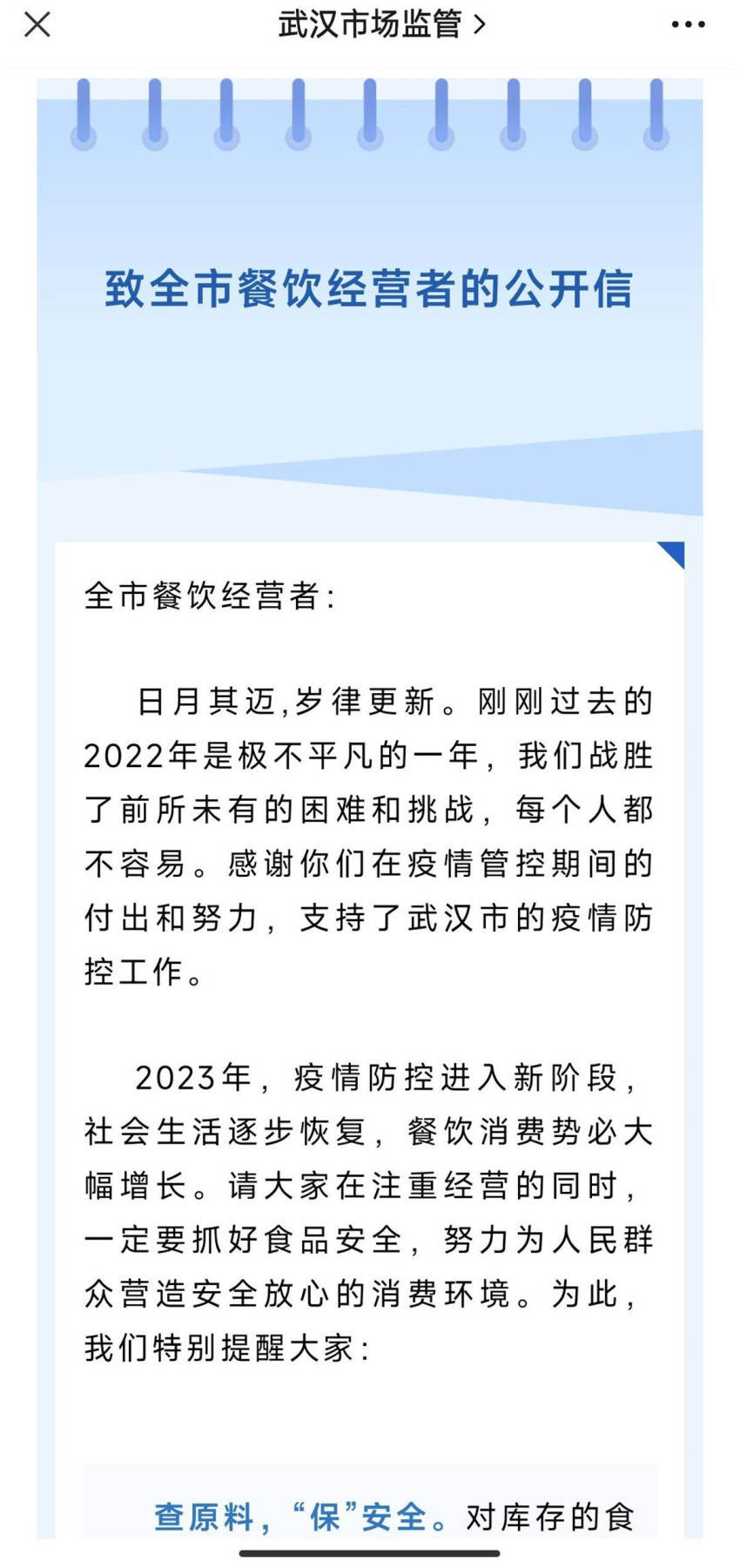 1月18日,武汉市市场监管局发布《致全市餐饮经营者的公开信》,提醒全市餐饮经营者在注重经营的同事,抓好食品安全,营造安全放心的消费环境。具体包括:查原料,“保”安全;搞卫生,“靓”环境;严晨检,“守”健康;勤消毒,“除”病菌;守品种,“防”风险等。