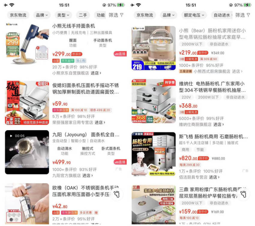 以京东平台售卖的肠粉专用机为例,其产品评论量相对较高也只有1万+,而面条专用机的评论量则高达20万+。评论相差较大的背后,也从侧面说明二者销量的差异。