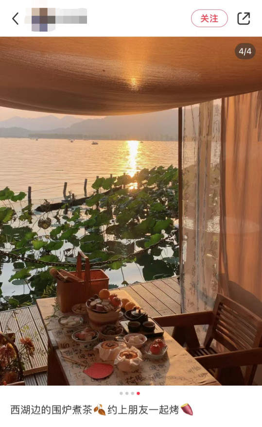 杭州湖滨附近的一家咖啡店,就做起了围炉煮茶的生意,为了吸引更多人眼球,直接把炉子拉到西湖边,营造一种“在西子湖畔煮茶、赏荷、看夕阳”的惬意氛围。当然,氛围感拉满的围炉煮茶价格并不便宜,589元的套餐只能在湖边的位置吹风两个小时。尽管一壶茶、几碟果子的成本价,大概率只有几十块钱。