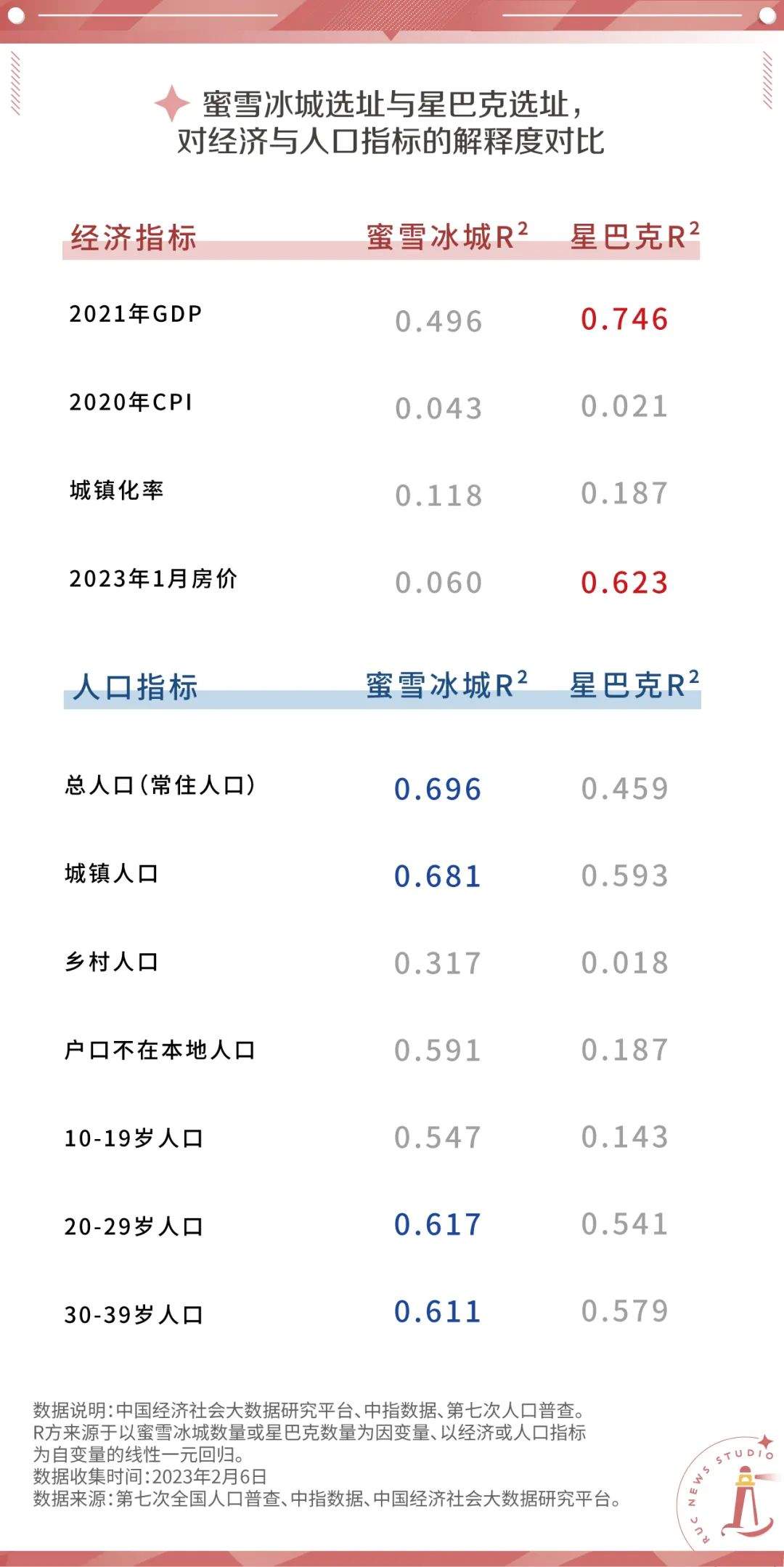 就单项指标而言,星巴克的门店数与当地的GDP、房价相关性较高,而蜜雪冰城的门店数与这些指标缺乏显著相关性。因此,较蜜雪冰城而言,星巴克的门店数确实更能折射一地的经济发展水平。