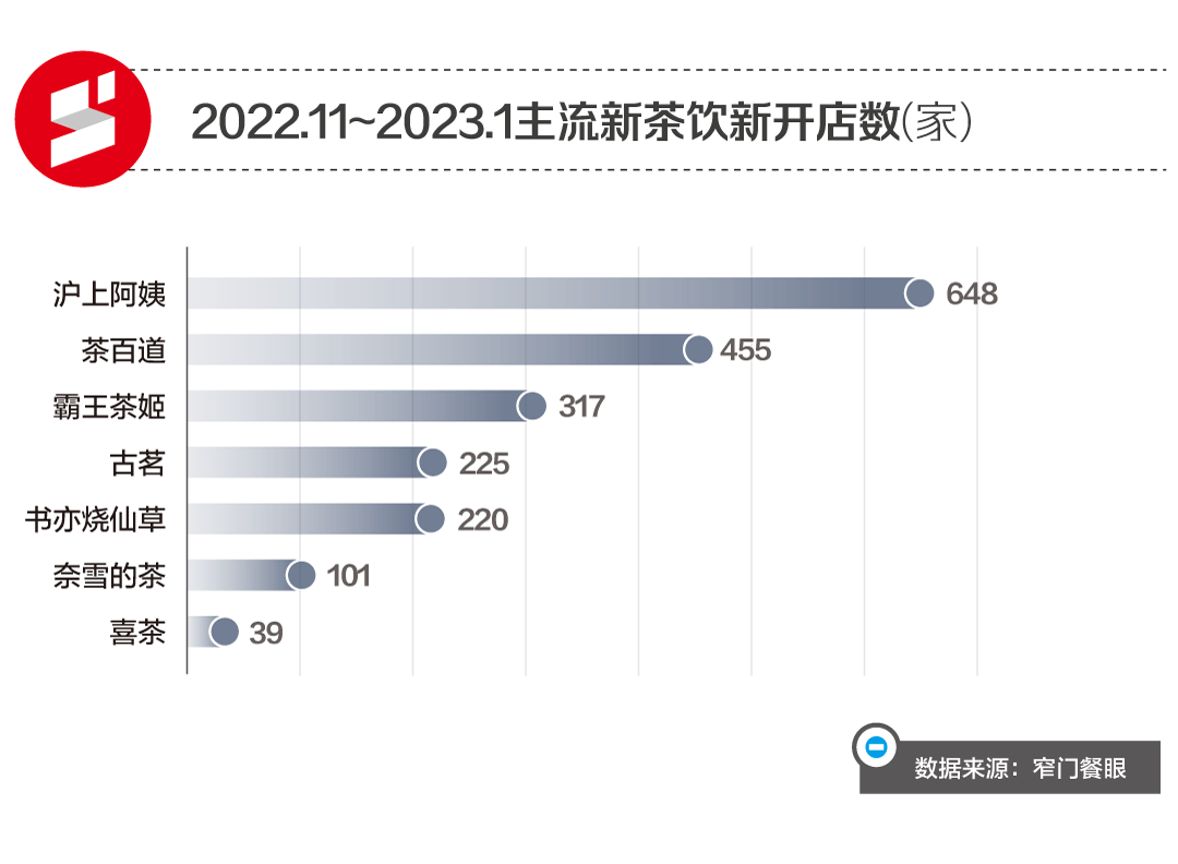 市场上也开始不断冒出新玩家。去年8月,“啊爆柠檬茶”宣布完成千万级天使轮融资。12月,气泡茶品牌“别样泡泡”、茶咖新品牌“如此多娇”分别完成了千万级天使轮融资。去年年底,从广东走向全国的“霸王茶姬”出圈,12月新开门店206家,一年内门店总数便突破了千家。