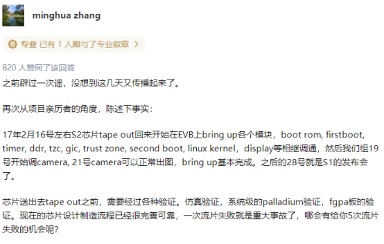 除此之外,对于当时“澎湃芯”的进展,此人还曾回应了两点: