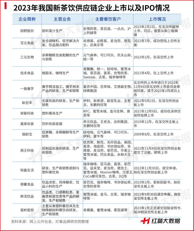 另外,随着茶饮品牌扩张步伐加速,市场红利也传导到供应链企业身上。这两年,元气森林背后的三元生物、蜜雪冰城背后的佳禾食品相继上市,田野股份、德馨食品、恒鑫生活、南王科技纷纷递表,在资本市场门口排起了队。