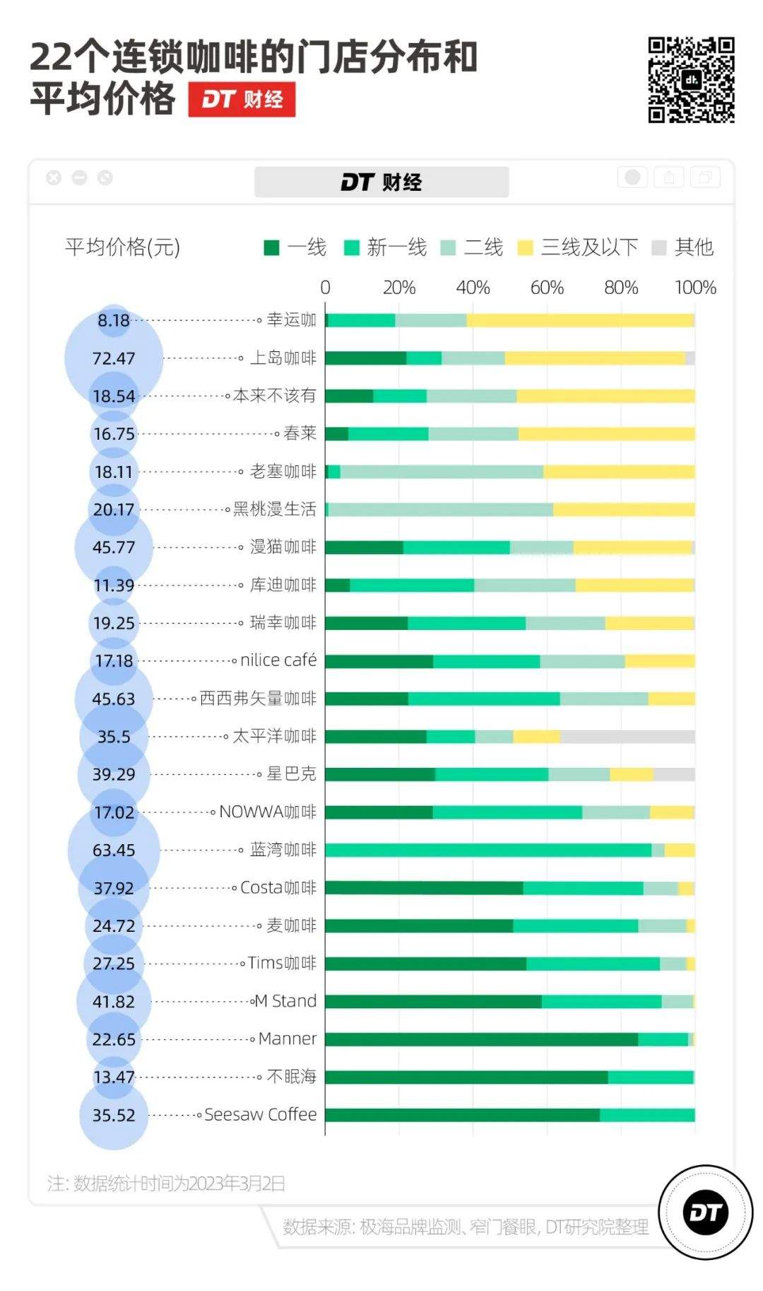 DT财经选取了22家总门店超过100家的连锁咖啡品牌,发现它们三线城门店数的占比和平均价格并不成正比——县城咖啡,是低价和高价的同时迸发。