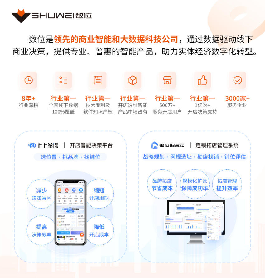 数位是一家专注于商业智能的大数据科技公司,由蚂蚁金服、博将、赛富等知名机构投资。自2015年成立以来,数位始终致力于线下商业大数据建设和行业应用,相继推出了服务于个人和连锁品牌客户的开店数字化产品上上参谋(APP)和数位拓店云(SaaS),已服务数百家头部知名企业和千万用户。