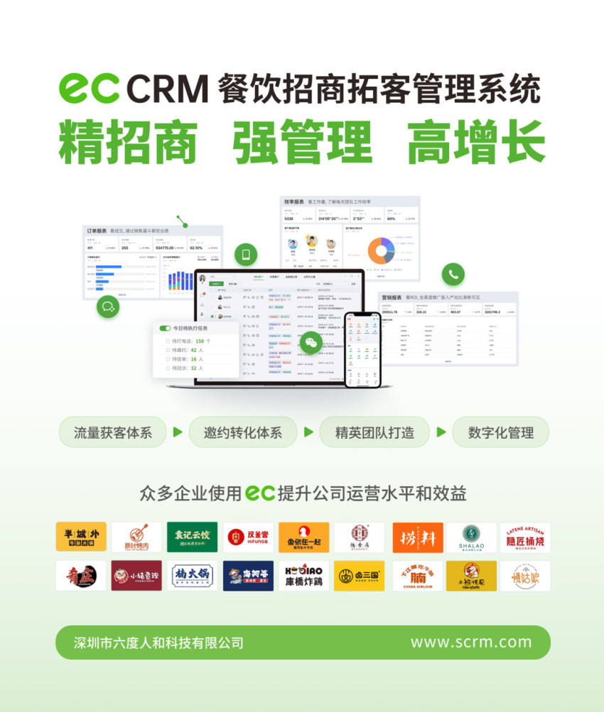 EC CRM餐饮招商拓客管理系统,是深圳市六度人和科技有限公司主营、腾讯战略投资的智能招商系统。餐饮加盟行业品牌多、竞争激烈,投资者选择谨慎,获客难度大。EC系统连接企微、微信、工作手机、外呼/智能电话、广告平台等,为餐饮企业建立营销一体化的数字化运营体系,全面提升私域运营/客户跟进/转化成交效率。广州丰铂餐饮、济南店数帮扶、青岛丽盛餐饮、安徽万弘餐饮、鱼你在一起、卤三国、慢姑娘等众多餐饮企业都在用EC来提升效益。