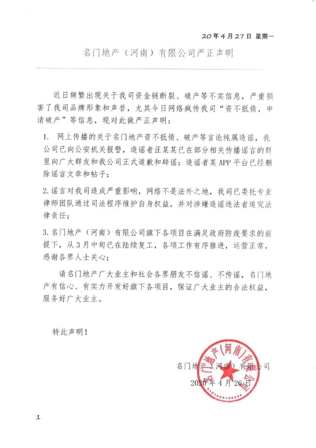 作为曾经的豫系房企代表,如今的名门已经难以招架这一切,这已经不是一纸严正声明可以解决的问题了。