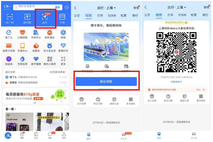 Ps:上海地铁乘车码领取方式:打开手机支付宝—点击最上方出行—点击地铁(前往领取)—获得乘车码