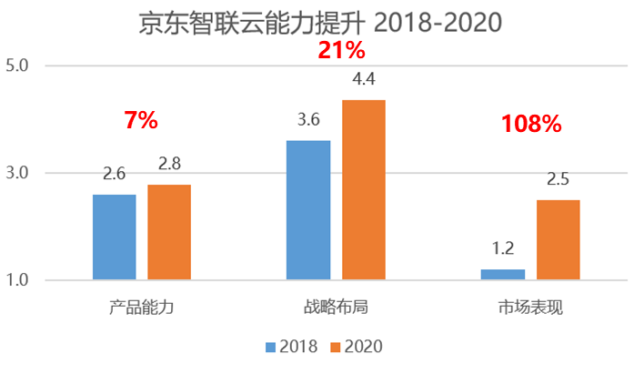 例如,Forrester报告中,相较2018年,京东智联云在产品能力、战略布局、市场表现这三个核心方面均有大幅提升,分别增长了7%、21%和108%。