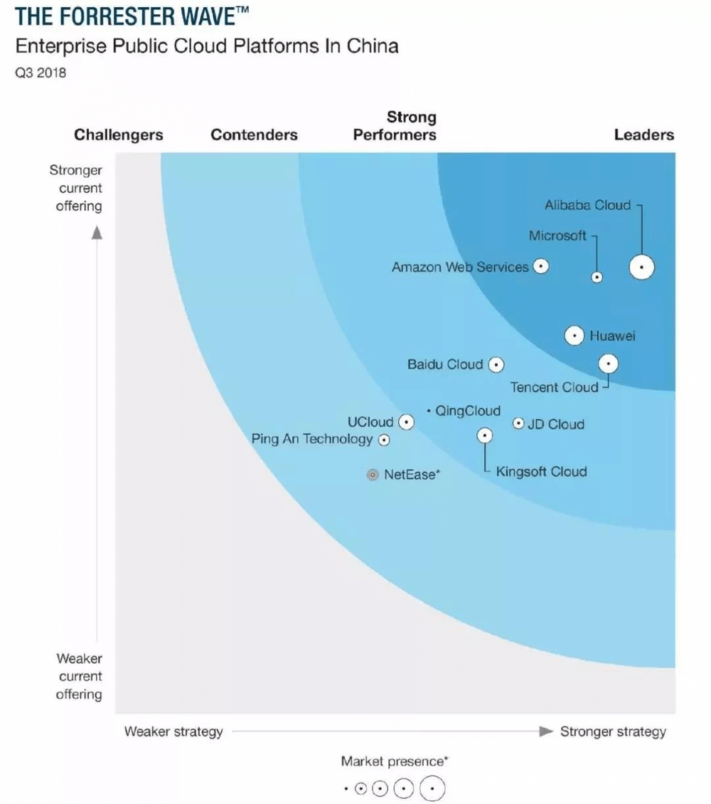 这是2018年Forrester报告中,中国云计算市场上厂商分布情况: