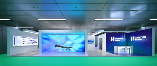 展厅视觉冲击来自于其别具一格的色彩搭配,取色于韩拓科技最新品牌LOGO色彩搭配,将青绿与智慧蓝结合,互相渗透交互相交融。这不仅让韩拓科技在众多品牌中脱颖而出,也无疑刷新了观众对家居材料企业的全新认知。