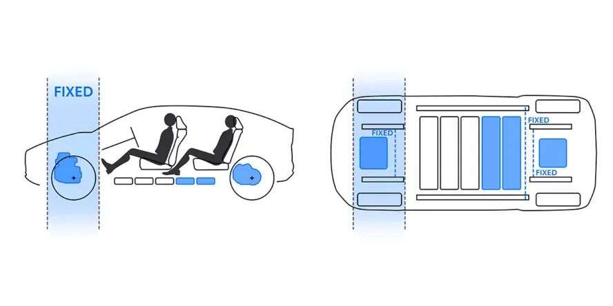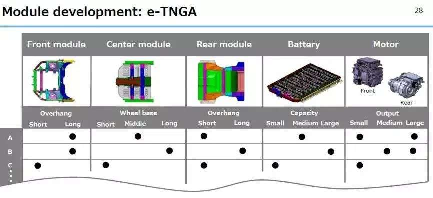 和大众MEB类似,e-TNGA固定了车辆的前后电机位置、前桥、电池包宽度,而轴距、长度、宽度、驱动形式以及电池包数量都可以灵活调整,这使得丰田可以用更低的成本和更短的周期开发出更多电动车型。