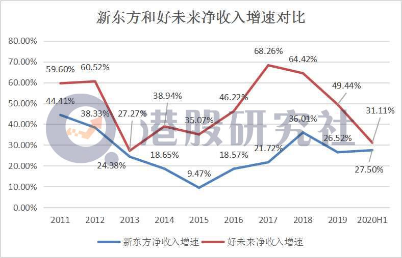 除了公司内部存在的一些隐患之外,在行业内,新东方所处的竞争环境也愈发恶劣。首先就是老牌竞争对手好未来与跟谁学。从净收入增速来看,近十年好未来的增速始终高于新东方的增速,且在2014-2019财年,好未来净收入增速均领先新东方净收入增速20个百分点以上。跟谁学最新财报也实现了营收同比增长366.6%;净利润同比增长13.4%。二者的业绩表现都远远优于新东方。
