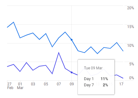 下图中是次日留存和 7 日留存的变化曲线,X 轴是日期,Y 轴是留存率,业务含义即在 X 日新增的用户,其对应的 n 日留存率是 Y。