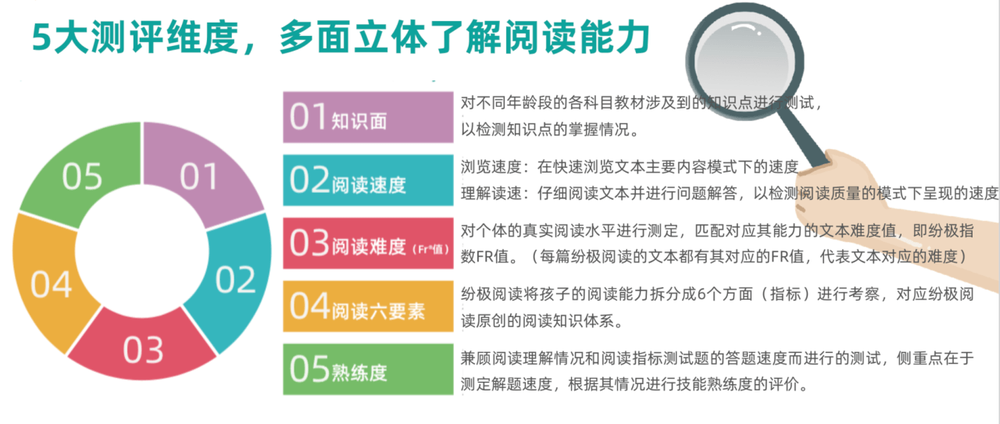 纷极阅读测评系统是一款中文分级测评系统,其基于纷极阅读联合北大计算语言学研究所制定的FR中文分级标准,主要从知识面、读速、熟练度、阅读难度(FR值)、六要素等5大维度入手考察,囊括锚定部编版语文课标及国际研究著作。产品以海量的中文数据作为支撑,对用户的阅读能力进行综合测评分级,精准度处于国内领先地位。