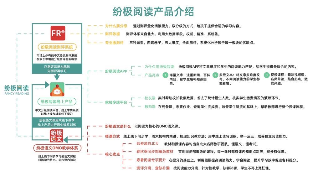 针对中国小学生普遍阅读能力缺失的现状,纷极阅读制定适用于中文的阅读分级体系,利用AI技术锚定小学教材,提供合适的阅读学习内容。公司现已搭建起纷极阅读测评系统、纷极阅读在线阅读平台、OMO纷极语文课三条产品线,帮助学生高效提升阅读能力。