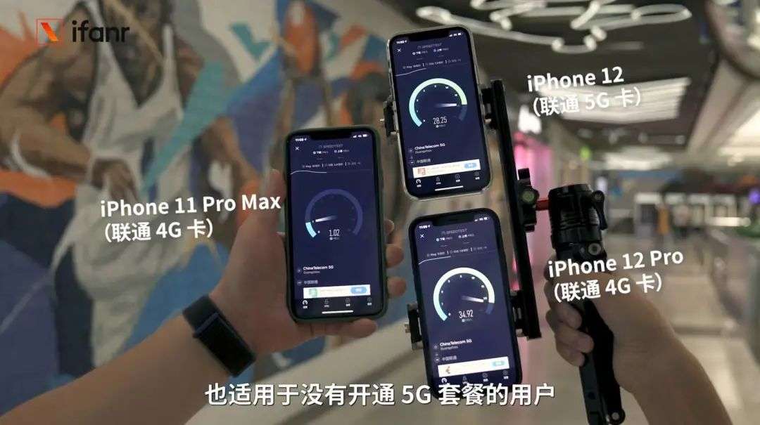 我们手上就有一张没开 5G 的联通 4G 卡,插到 iPhone 12 后,信号栏上也显示了 5G 的标志,速率上也会比 4G 卡插 4G 手机要快。