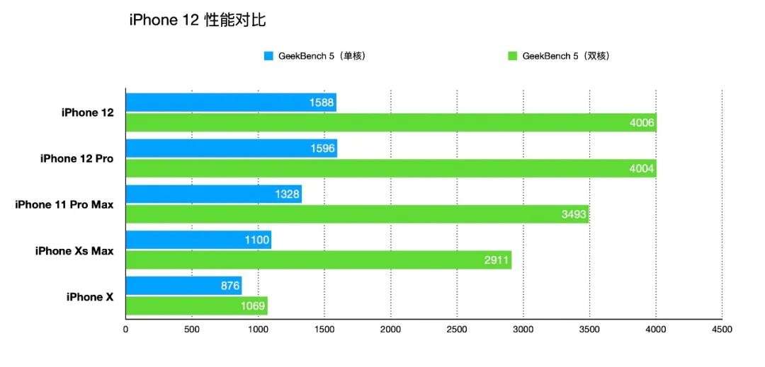 今年全系 iPhone 12 都用上了 A14 仿生芯片,根据 GeekBench 5 的测试数据,对比 iPhone 11 Pro Max 的 A13,A14 在 CPU 单核有着 20% 的提升,而多核部分也有 15% 的提升。