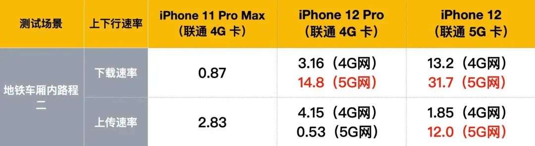 更大的差异是由 5G 带来的。只要测试场景能搜到 5G 信号,那么,对比 iPhone 11 Pro Max,iPhone 12 都能在速率上比它快 6-7 倍。