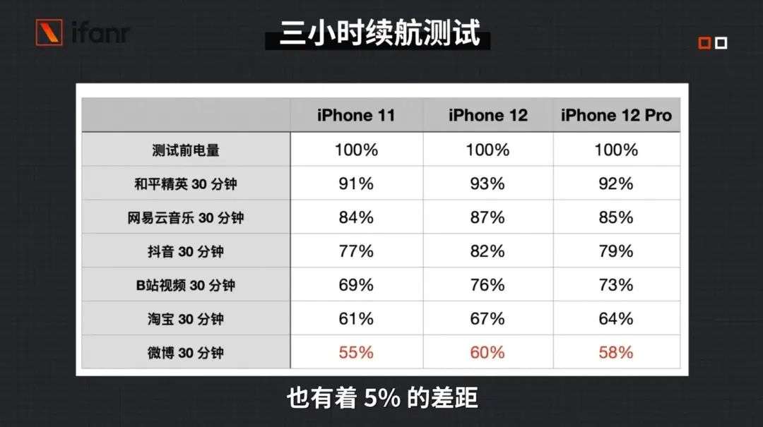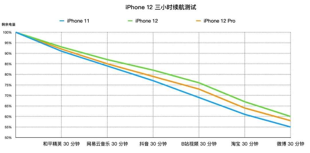 但如果拿 iPhone 12 与 iPhone 11 对比,三小时过后,两款手机的剩余电量也有着 5% 的差距,说大不大,但这点电,也能让你多看 30 分钟视频。