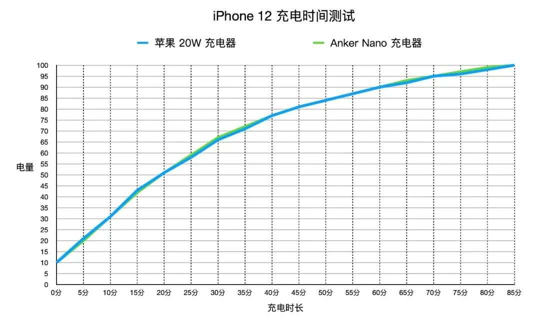 我们测试了一下 iPhone 12 的充电速度。同样是 30 分钟,苹果官方 20W 充电器将 iPhone 12 从 10% 充到了 66%,Anker Nano 从 10% 充到了 67%,完全充满,耗时都在 85 分钟左右。