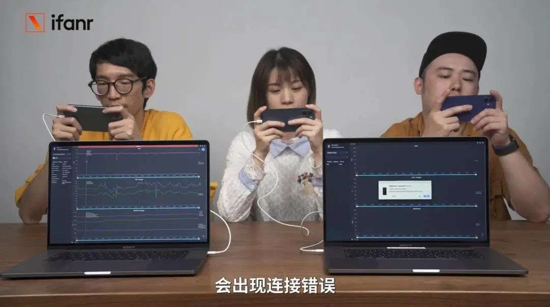 但我们没想到的是,这两台 iPhone 12 都预装了最新的 iOS 14.1 系统,而这个固件,在我们评测时并未正式发布。这就导致 iPhone 12 在连接 macOS 系统时,会出现连接错误,同时也无法被软件抓取到测试数据。