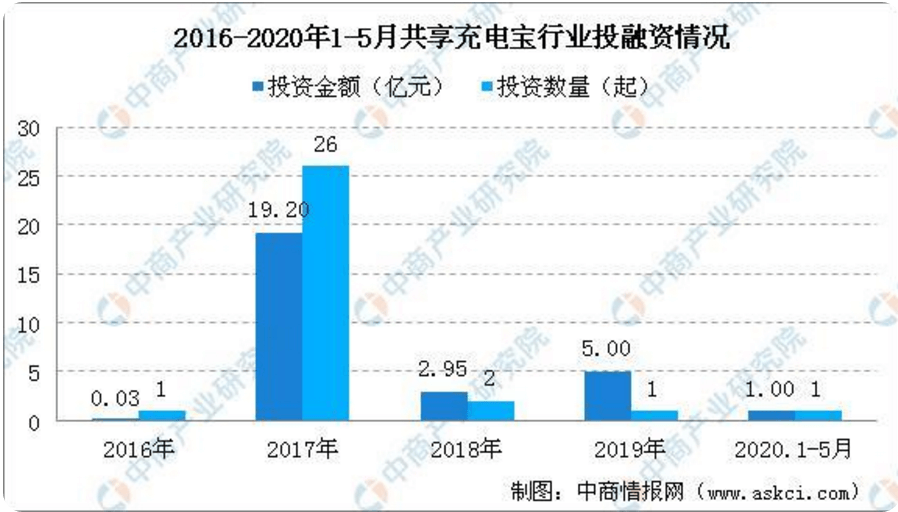 从共享充电行业来看,近五年来共享充电宝行业投融资情况大不如前。据IT桔子数据统计显示,2016-2019年我国共享充电宝行业投融资事件数量及金额波动较大。2017年共享充电宝行业投融资达到近五年峰值,全年发起投融资事件26起,投资金额为19.2亿元。