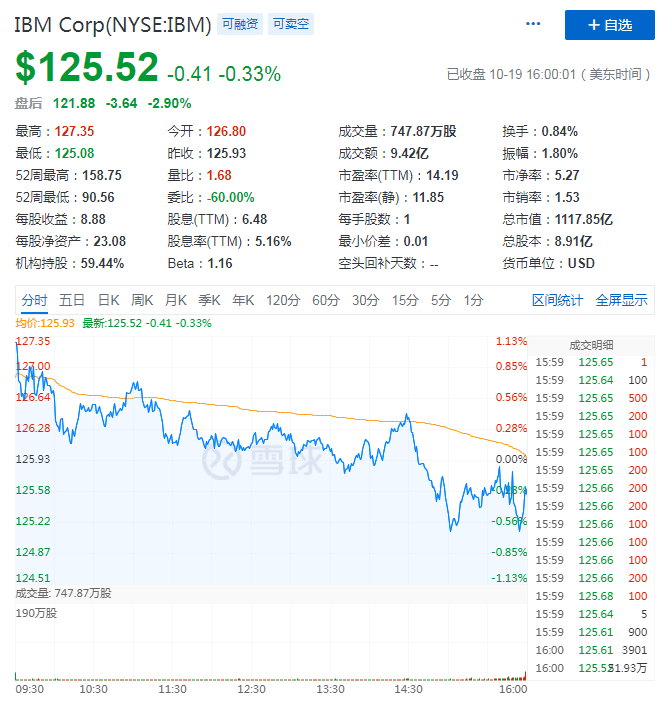 美东时间10月19日盘后,IBM对外发布2020财年第三季度的财报,财报公布后,刺激其股价在盘后交易中下跌约3%。虽然其股价下跌不无受三大股指集体下行的影响,但高于大盘的跌幅也表明了资本市场对这份财报的态度。截至美股研究社发稿,IBM盘后每股报121.88美元,盘后下跌2.90%,总市值为1117.85亿美元。
