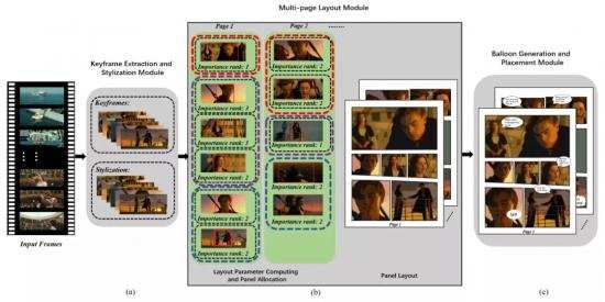 随后,根据关键帧的兴趣区域、重要性等级、彼此间的语义关系和页面上的面板数量来决定漫画的分格大小及数量,生成多页面布局。