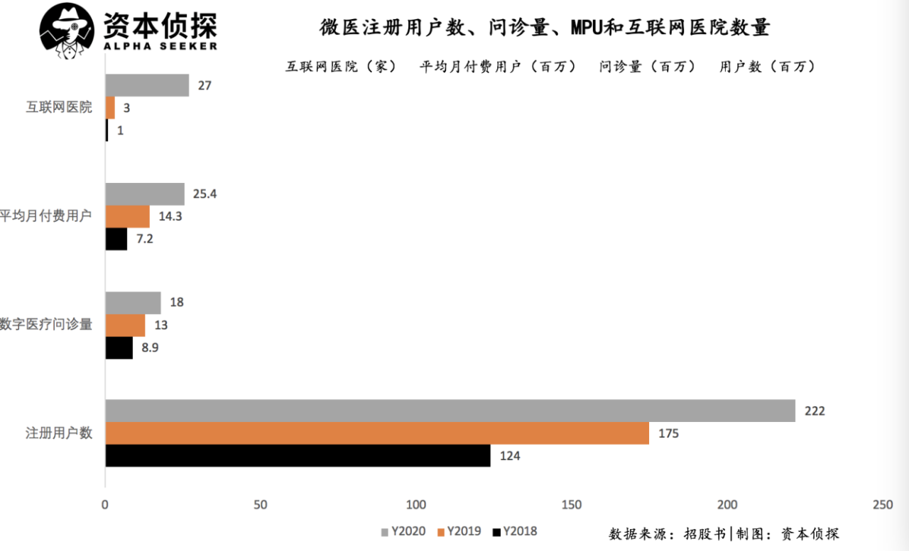 注册用户数方面,2018年到2020年,微医控股从1.24亿发展到2.22亿,MPU(月度付费用户)达到2540万,明显高于行业平均水平。