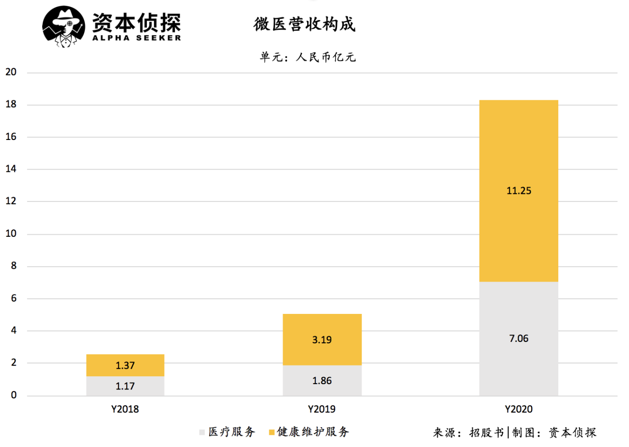 微医控股的两大核心业务是医疗服务与健康维护服务。其中,2020年医疗服务收入7.06亿元,占比38.6%,健康维护服务收入11.25亿元,占比61.4%。