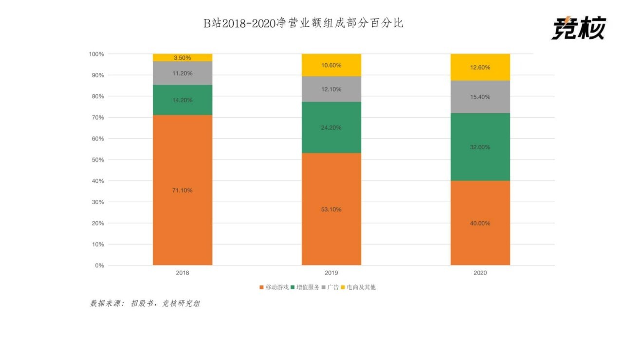 登陆资本市场的三年间,游戏在B站净营业额组成部分占比分别为71.1%、53.1%、40%。