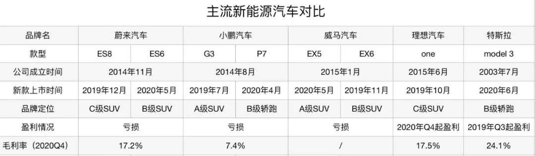 零态LT对比了当前市场主流智能电动汽车的经营数据(截至2020年9月)发现,新能源汽车“标杆”特斯拉成立16年才实现盈利,毛利率稳定在20%以上。而蔚来、小鹏、威马和理想虽然推出首款量产车的时间仅耗费了5年左右,但盈利情况一直不佳;仅理想汽车一家从2020Q4起实现盈利,毛利率达到17.5%;小鹏汽车更是在去年四季度首次实现毛利率转正。