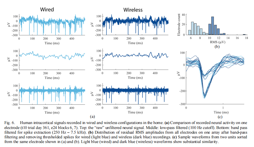 报告称,无线设备在 10.6 Hz 至 19.5 Hz 频段观察到显著的局部场电位(LFP)活动。在 T10 进入睡眠期间,频段有明显的变化(~20-40 Hz 频段)。在 24 小时无线设备的记录是高度可靠的,信号没有中断。不过,在 288 个 5 分钟长的片段中,有 35 个片段因未记录到信号或噪音被干扰(共 175 分钟)。通过对比日志发现,绝大多数干扰发生在护士对 T10 进行翻身等护理的时候。