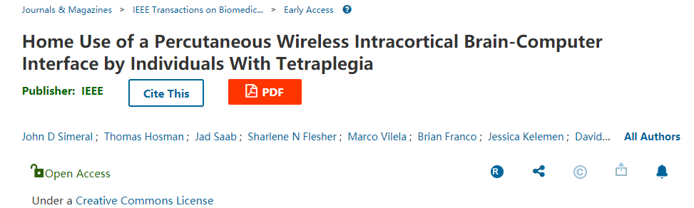 3 月 30 日,相关研究以“Home Use of a Percutaneous Wireless Intracortical Brain-Computer Interface by Individuals With Tetraplegia”为题发表在了 IEEE 生物医学工程学报(IEEE Transactions on Biomedical Engineering)上。