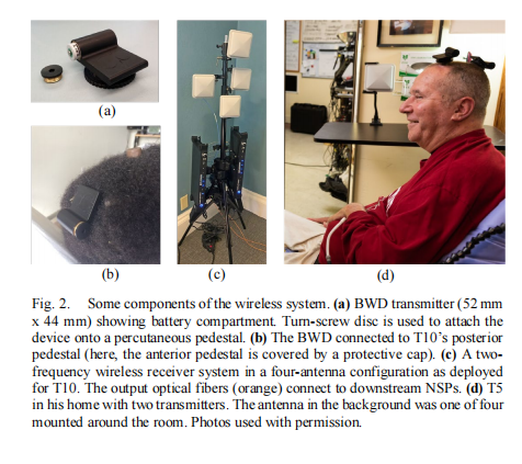 除此之外,传统的脑机接口外部电缆被一个最大尺寸约为 2 英寸、重量略高于 1.5 盎司的小型发射器所取代,也就是上文提到的布朗无线设备(BWD)。该设备可数字化每个电极上的神经活动,并用曼彻斯特编码(Manchester encoding)通过定制的低功耗协议将其传输到附近的天线。BWD 使用不可充电的医用级电池 (SAFT LS14250) ,且已经通过了临床前设备安全性评估。该装置位于使用者的头顶,使用与有线系统相同的端口连接到大脑运动皮质内的电极阵列。