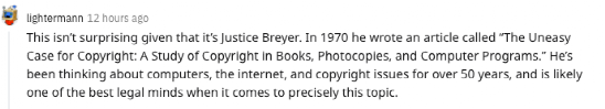 「考虑到是布雷耶大法官,这并不奇怪。1970年,他写了一篇文章,题为“令人不安的版权案例:书籍、复印文件和计算机程序的版权研究”。50多年来,他一直在思考计算机、互联网和版权问题,在这方面,他可能是最好的法律专家之一。」