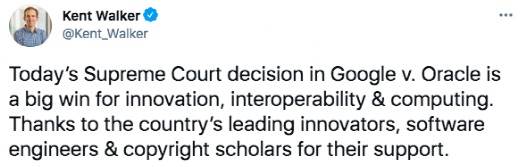 谷歌负责全球事务的高级副总裁Kent Walker在判决发布后在Twitter上发文称:「今天最高法院在谷歌诉甲骨文一案中的判决是创新、互操作性与计算的一大胜利。」
